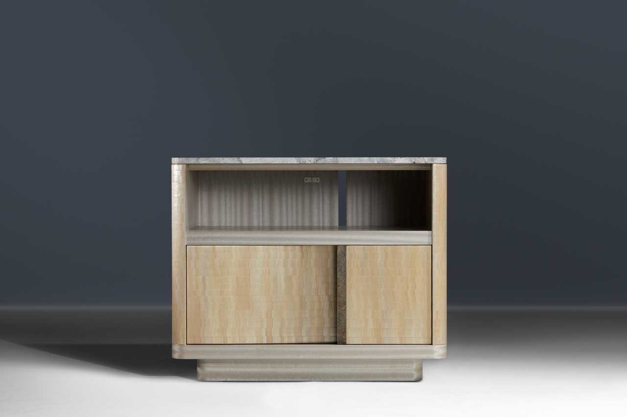 Gentle lines and details in a generous bedside cabinet with a harmonious balance of materiality and form that combines formal and aesthetic elegance with technical innovation. A slice of Breccia Marble tops the cabinet full of inclusions. Natural straw marquetry wraps the piece and a deep double-drawer provides a lovely space for everything that is put away during a deep sleep.