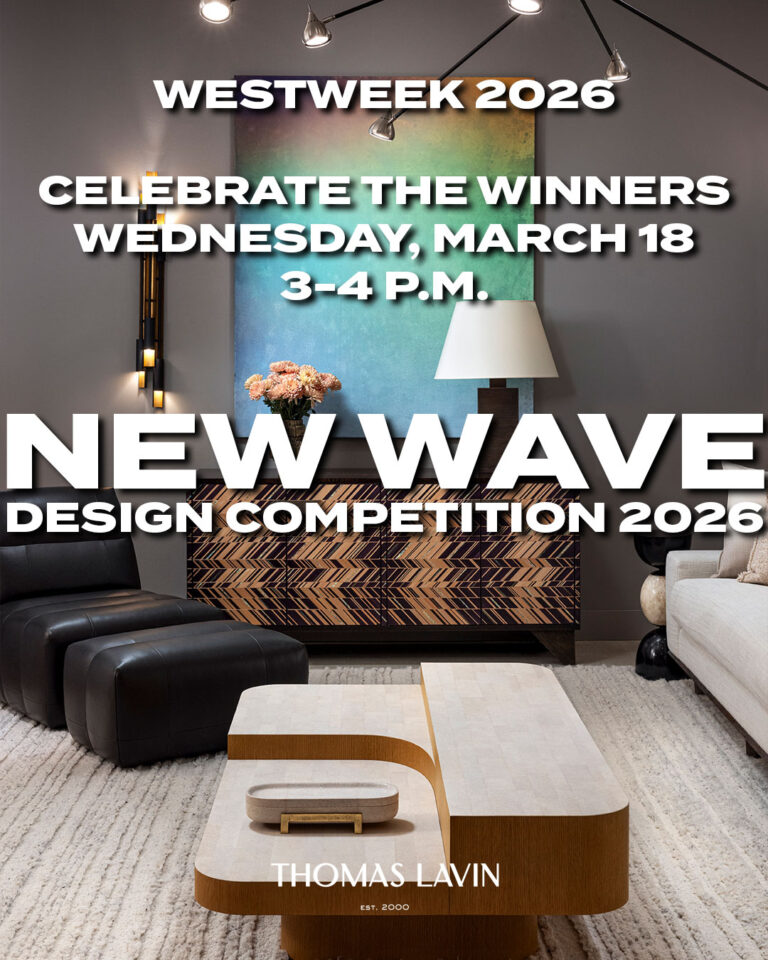 CELEBRATE WESTWEEK AND THE WINNERS OF THE NEW WAVE DESIGN COMPETITION Wednesday, March 18 Make merry with us as we raise a glass to our wonderful industry and announce the winners of this year’s New Wave design contest, selected by judges Adam Hunter, Christina Rottman, Jacqueline Terrebonne, Kelly Badal Phillips, Laura Eckstein Jones, Lindsey Shook, Martyn Lawrence Bullard, and Thomas. The work of all contestants will be on display throughout WESTWEEK, so be sure to stop by and see the inspirational designs from SoCal’s up-and-coming designers. |